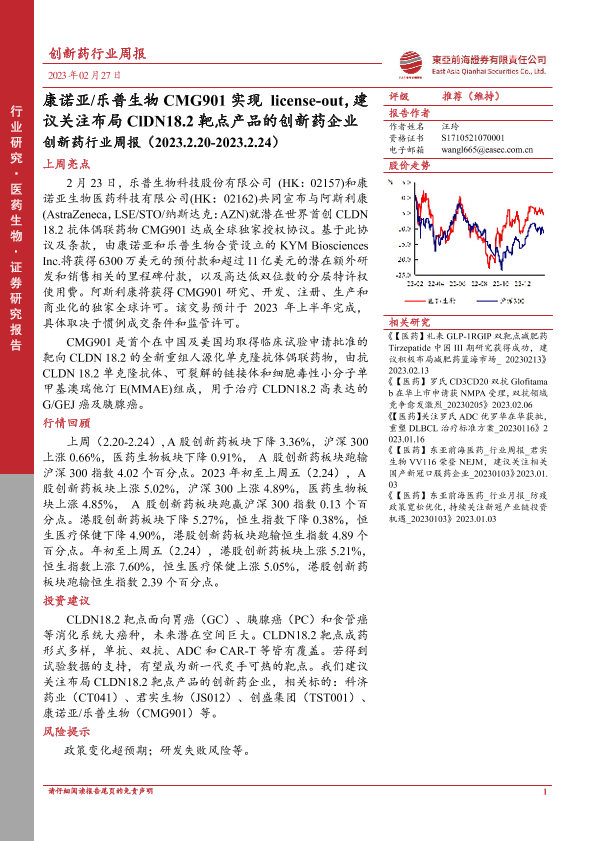 【东亚前海证券】【20230227】创新药行业周报:康诺亚 乐普生物CMG901实现license-out,建议关注布局ClDN18.2靶点产品的创新药企业-16页