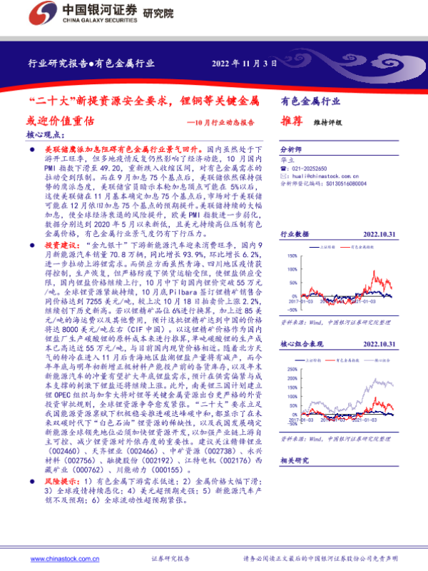 【银河证券】【20221103】有色金属行业10月行业动态报告:“二十大”新提资源安全要求,锂铜等关键金属或迎价值重估-24页