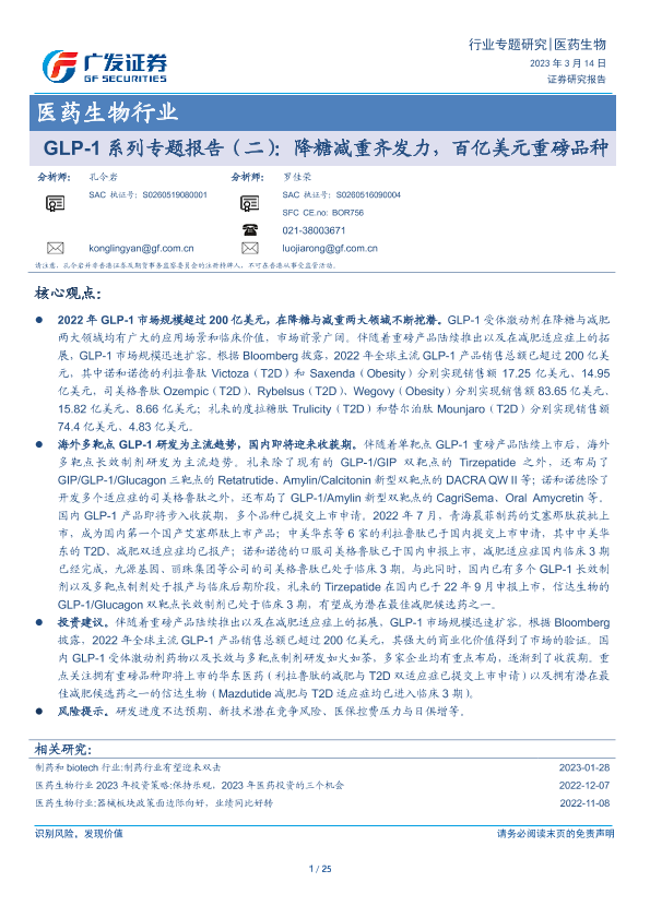 【广发证券】【20230314】GLP-1系列专题报告(二):降糖减重齐发力,百亿美元重磅品种-25页