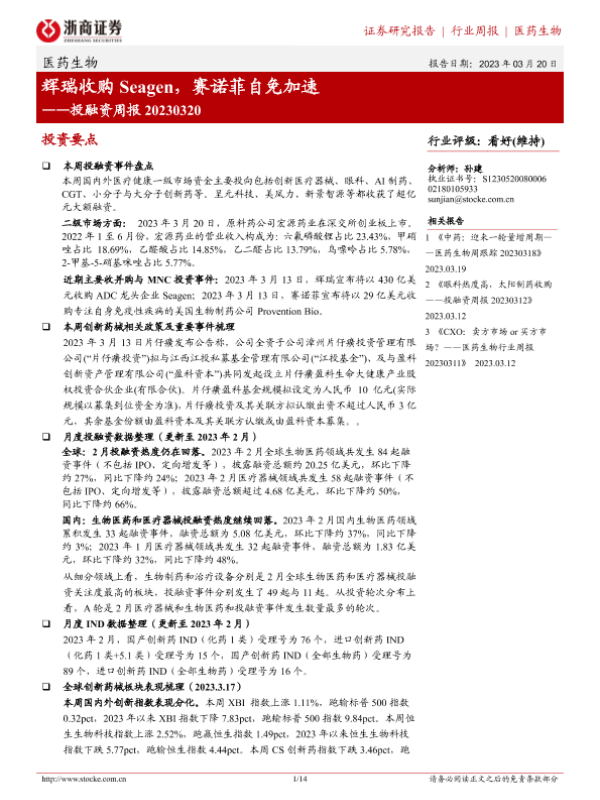 【浙商证券】【20230320】医药生物投融资周报:辉瑞收购Seagen,赛诺菲自免加速-14页