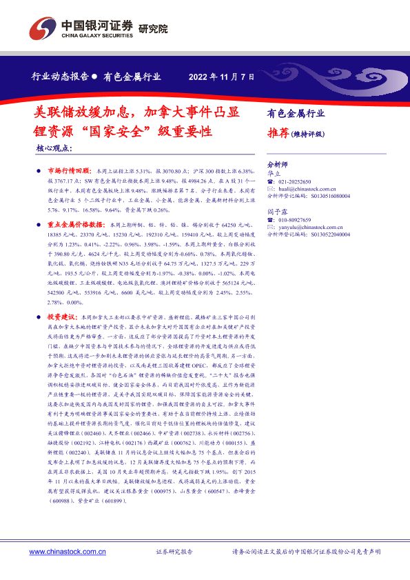 【银河证券】【20221107】有色金属行业动态报告:美联储放缓加息,加拿大事件凸显锂资源“国家安全”级重要性-19页