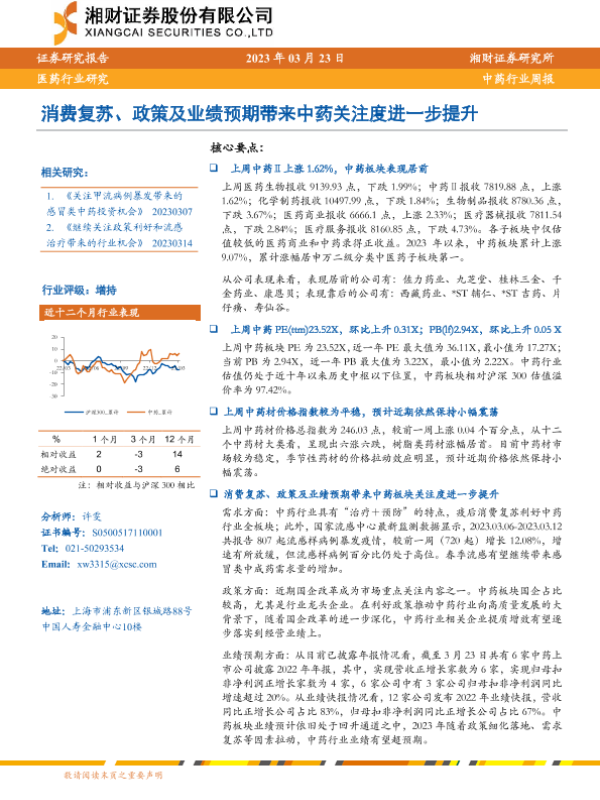 【湘财证券】【20230323】中药行业周报:消费复苏、政策及业绩预期带来中药关注度进一步提升-12页