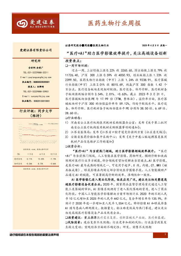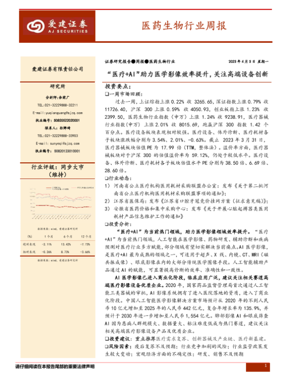 【爱建证券】【20230403】医药生物行业周报:“医疗+AI”助力医学影像效率提升,关注高端设备创新-16页