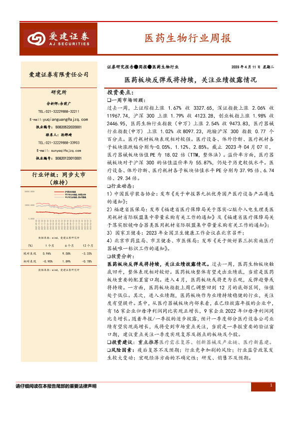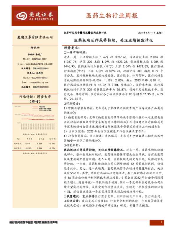 【爱建证券】【20230411】医药生物行业周报:医药板块反弹或将持续,关注业绩披露情况-15页