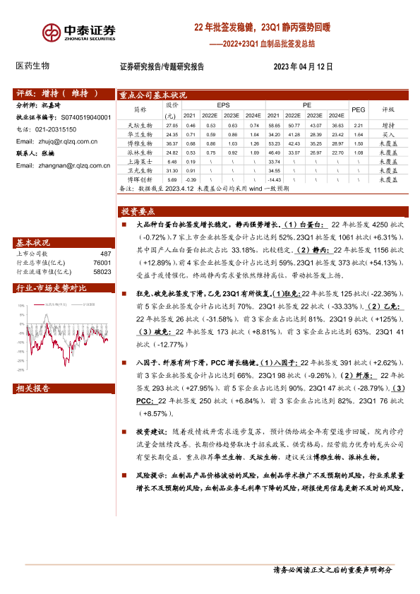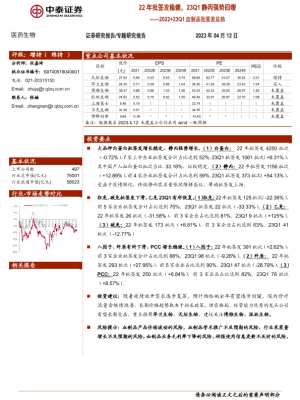 【中泰证券】【20230412】22年批签发稳健,23Q1静丙强势回暖-10页