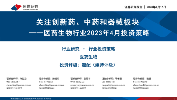 【国信证券】【20230416】医药生物行业2023年4月投资策略:关注创新药、中药和器械板块-35页