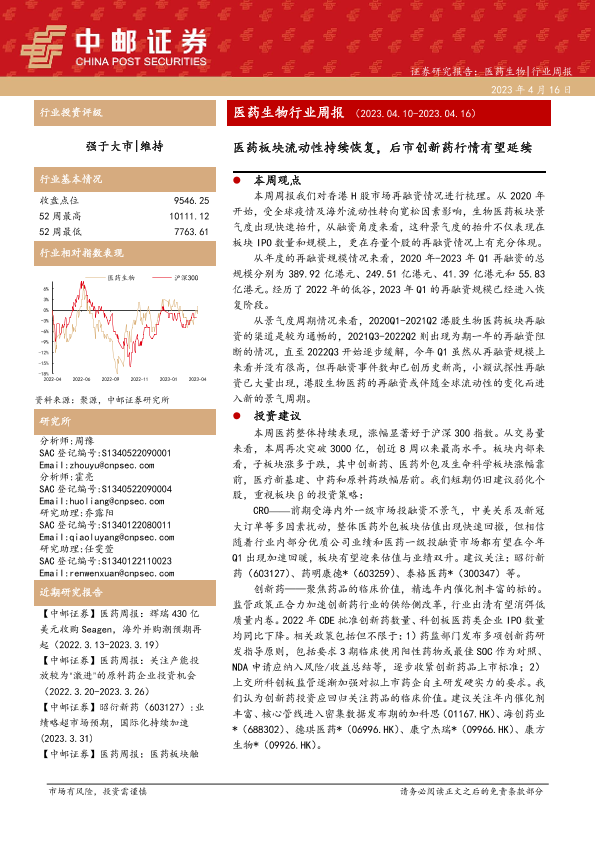 【中邮证券】【20230416】医药生物行业周报:医药板块流动性持续恢复,后市创新药行情有望延续-16页
