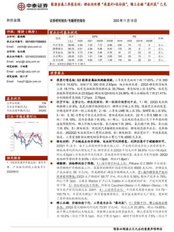 【中泰证券】【20221110】有色金属行业能源金属三季报总结:锂板块延续“高盈利+低估值”,稀土永磁“盈利底”已见-29页