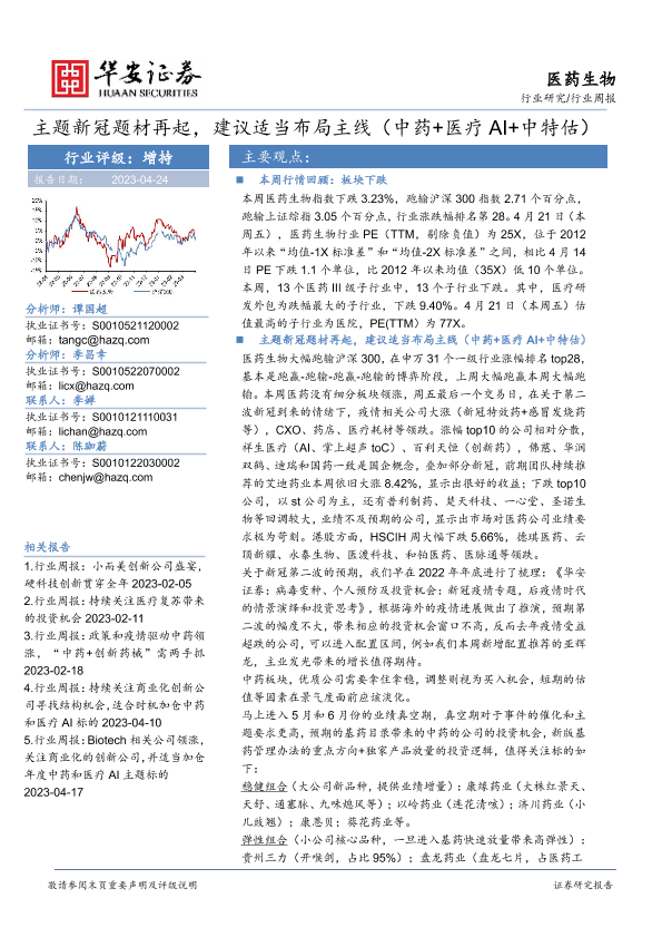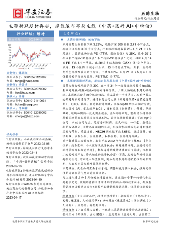 【华安证券】【20230424】医药生物行业周报:主题新冠题材再起,建议适当布局主线(中药+医疗AI+中特估)-20页