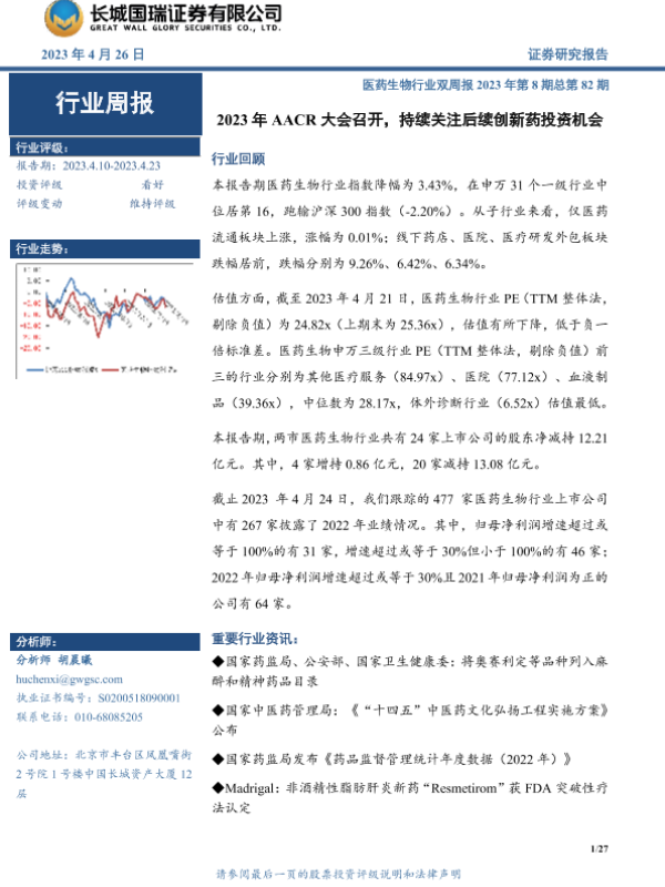 【长城国瑞证券】【20230426】2023年AACR大会召开,持续关注后续创新药投资机会-27页
