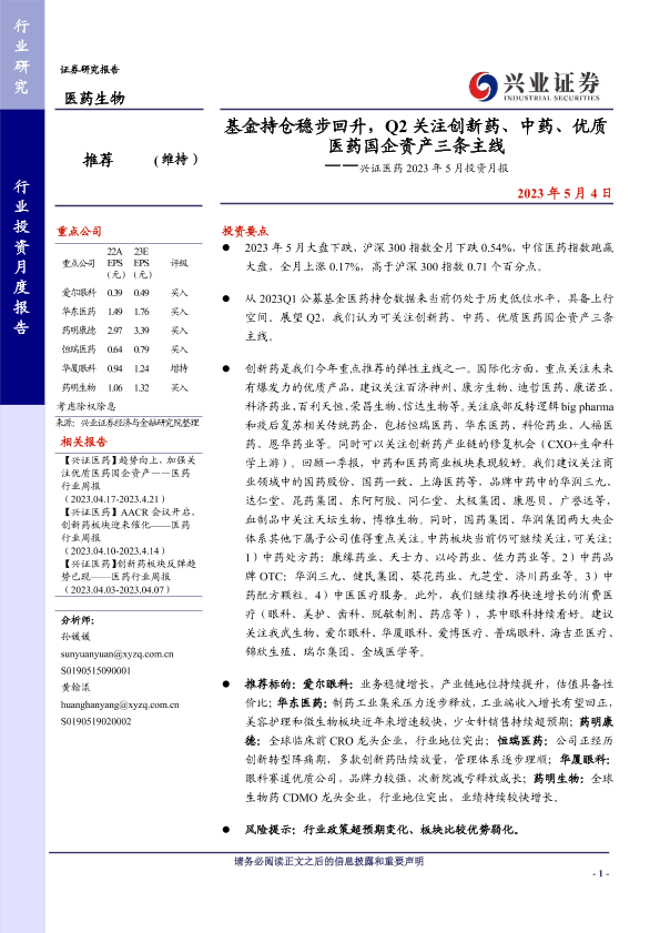 【兴业证券】【20230504】基金持仓稳步回升,Q2关注创新药、中药、优质医药国企资产三条主线-20页