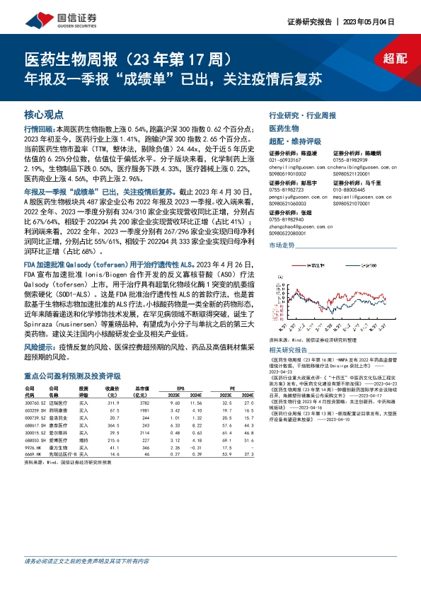 【国信证券】【20230504】医药生物周报:年报及一季报“成绩单”已出,关注疫情后复苏-13页