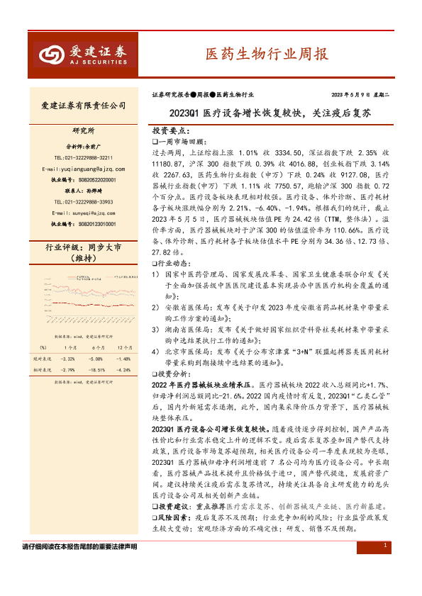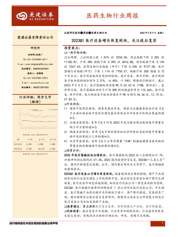 【爱建证券】【20230509】2023Q1医疗设备增长恢复较快,关注疫后复苏-18页
