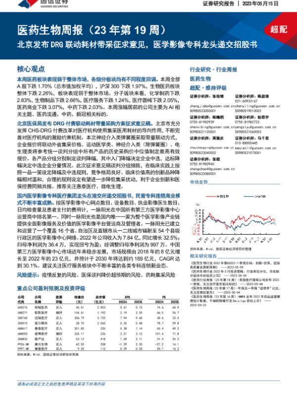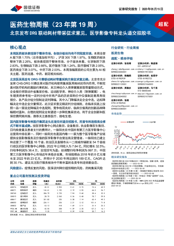 【国信证券】【20230515】医药生物行业周报:北京发布DRG联动耗材带采征求意见,医学影像专科龙头递交招股书-12页