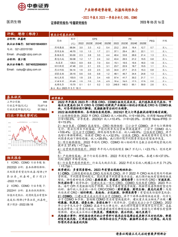 【中泰证券】【20230516】2022年报及2023一季报分析之CRO、CDMO:产业转移趋势持续,把握结构性机会-15页
