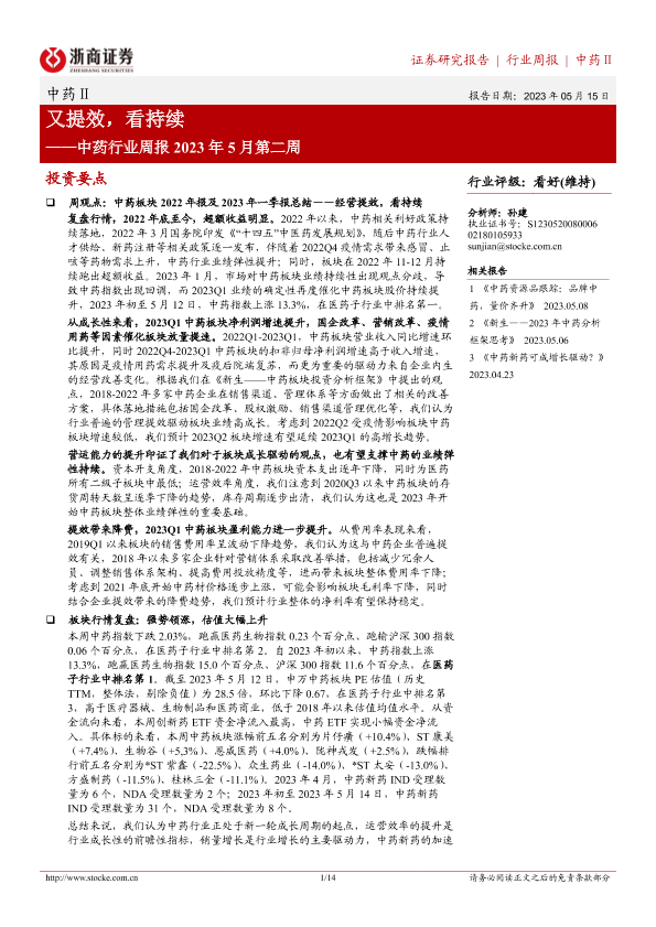 【浙商证券】【20230515】中药行业周报2023年5月第二周:又提效,看持续-14页