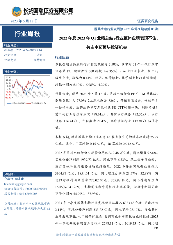 【长城国瑞证券】【20230517】医药生物行业双周报2023年第9期总第83期:2022年及2023年Q1业绩总结-37页