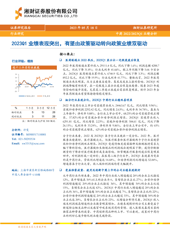 【湘财证券】【20230518】中药2022 2023Q1业绩分析:2023Q1业绩表现突出,有望由政策驱动转向政策业绩双驱动-20页