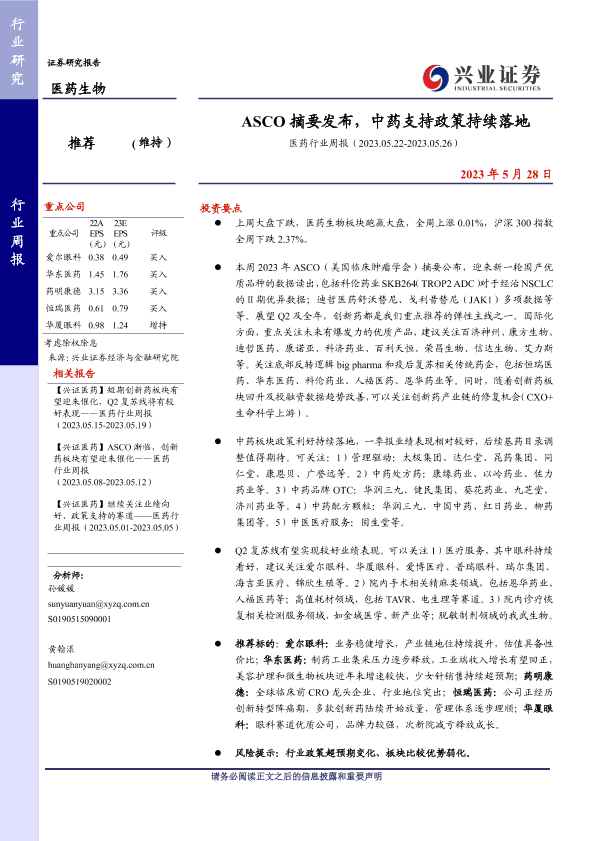 【兴业证券】【20230528】医药行业周报:ASCO摘要发布,中药支持政策持续落地-14页