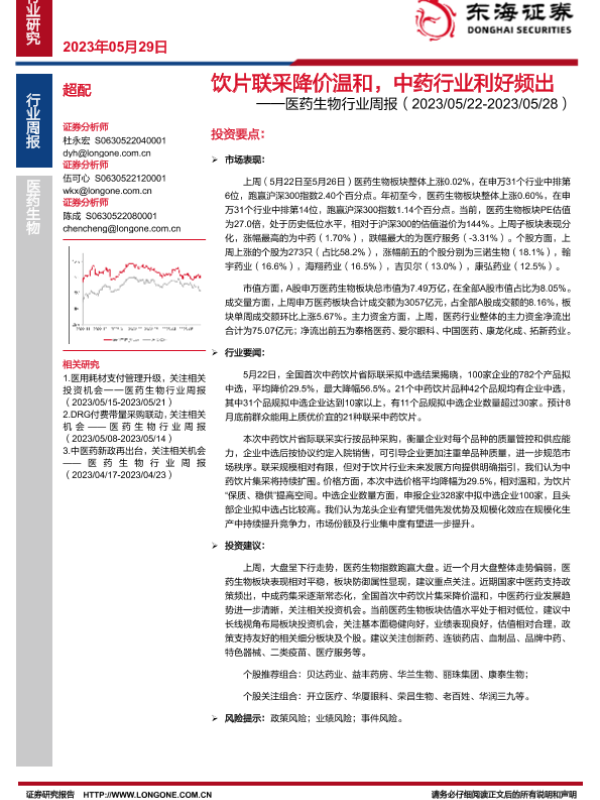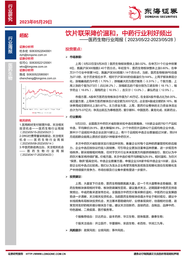 【东海证券】【20230529】医药生物行业周报:饮片联采降价温和,中药行业利好频出-13页