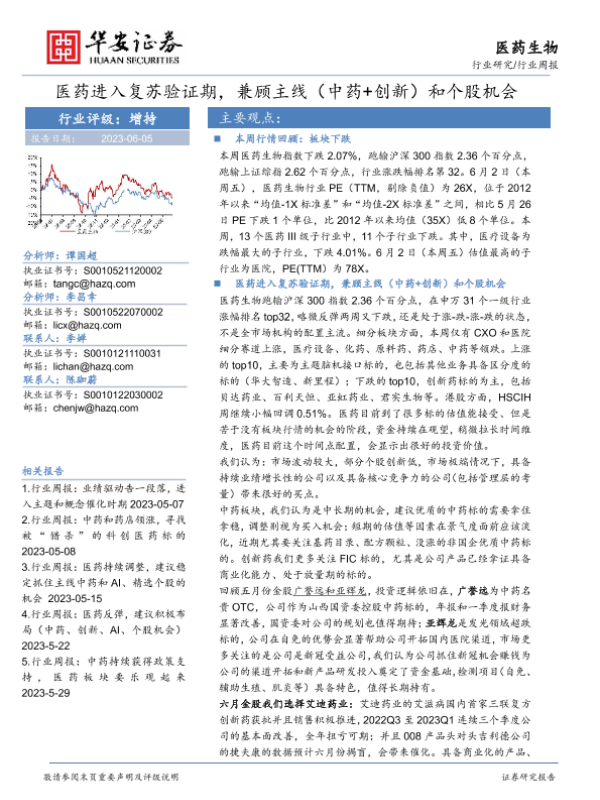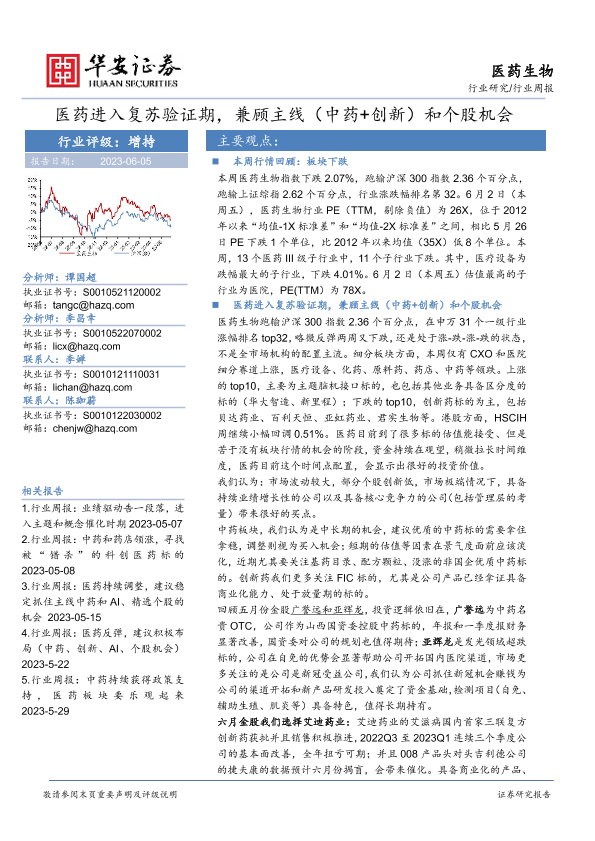 【华安证券】【20230605】医药生物行业周报:医药进入复苏验证期,兼顾主线(中药+创新)和个股机会-21页