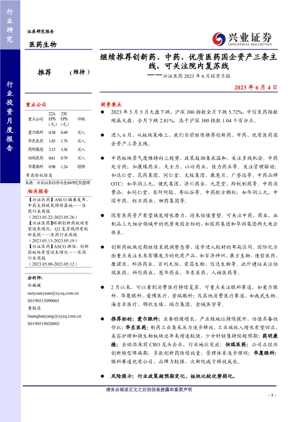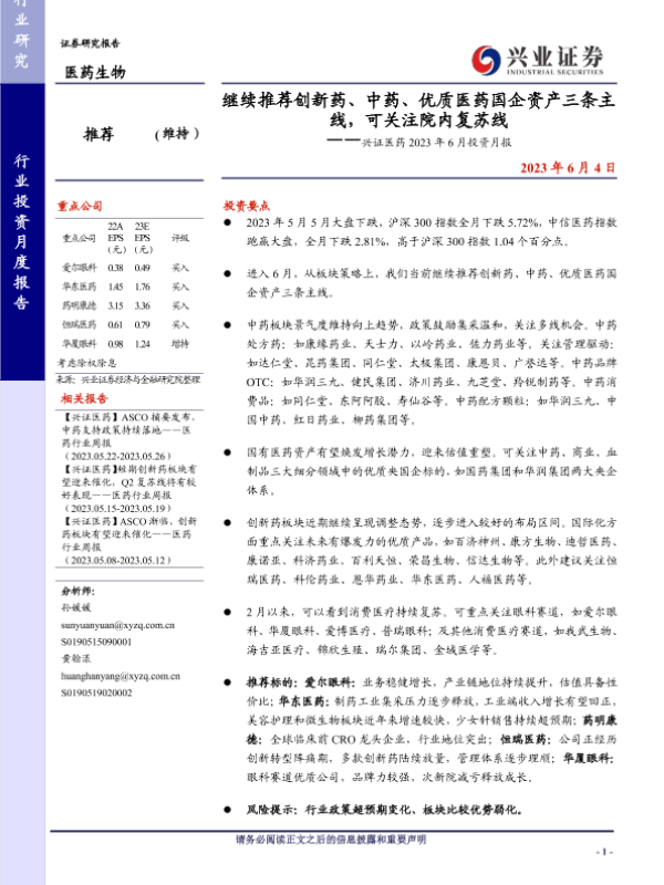 【兴业证券】【20230604】兴证医药2023年6月投资月报:继续推荐创新药、中药、优质医药国企资产三条主线,可关注院内复苏线-21页