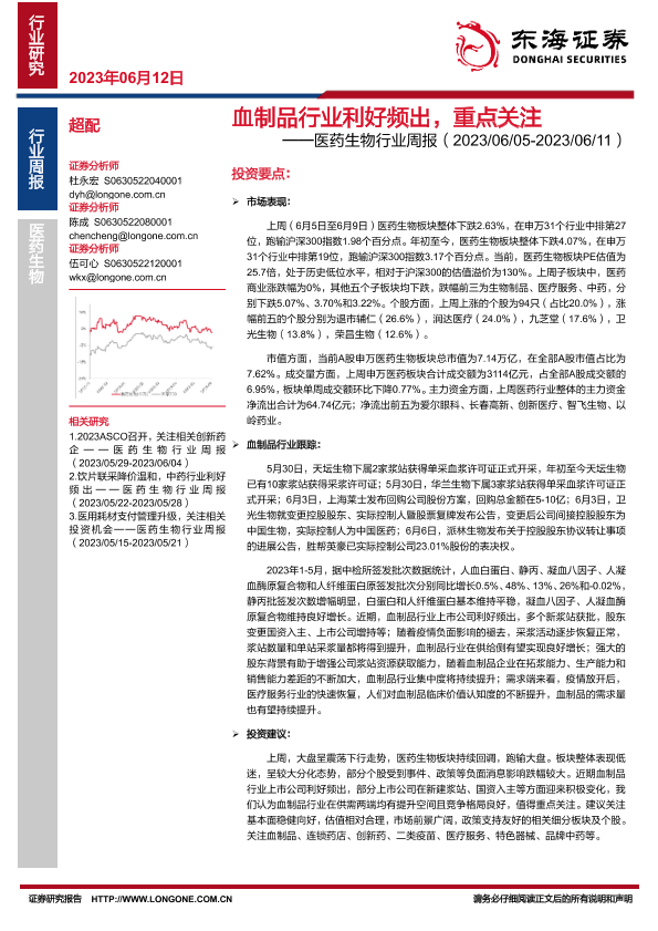【东海证券】【20230612】血制品行业利好频出,重点关注-18页
