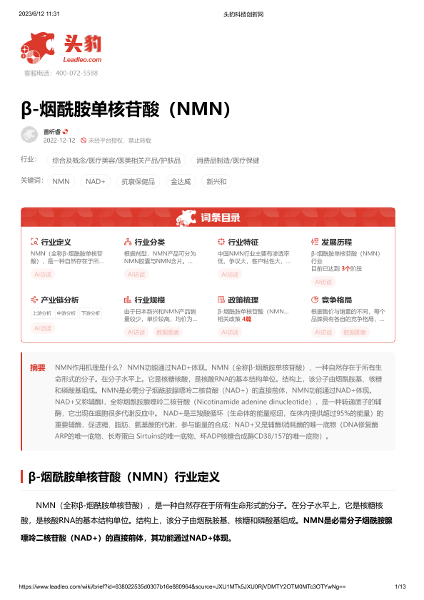 【头豹研究院】【20230612】β-烟酰胺单核苷酸(NMN)-13页