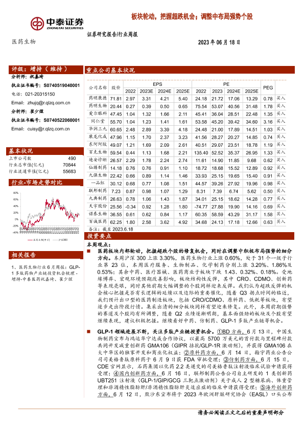 【中泰证券】【20230618】医药生物行业周报:板块轮动,把握超跌机会;调整中布局强势个股-11页