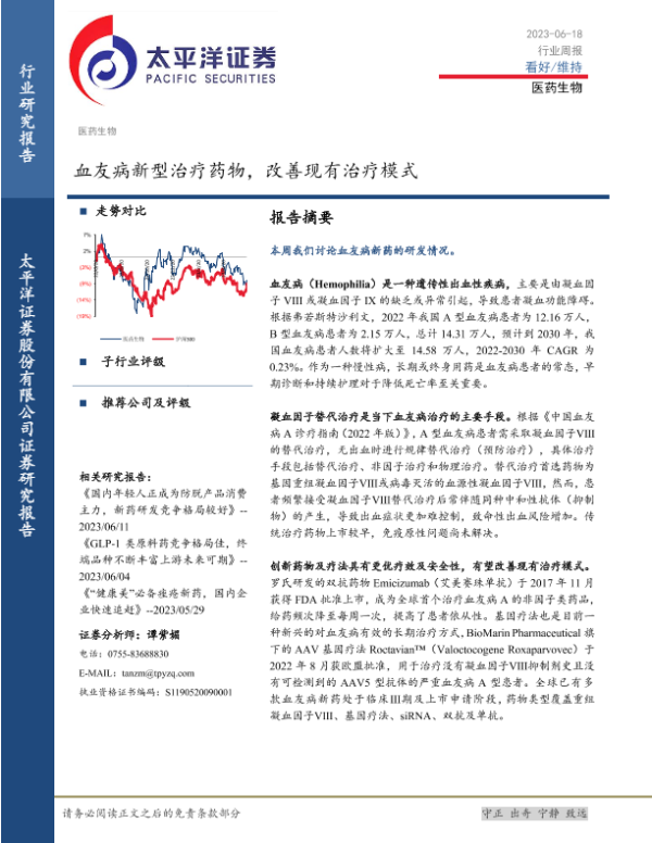 【太平洋证券】【20230618】血友病新型治疗药物,改善现有治疗模式-20页