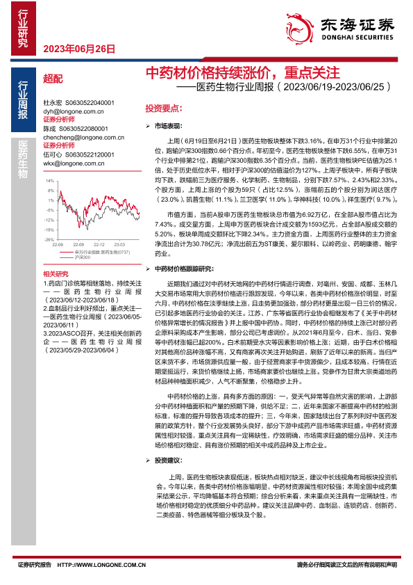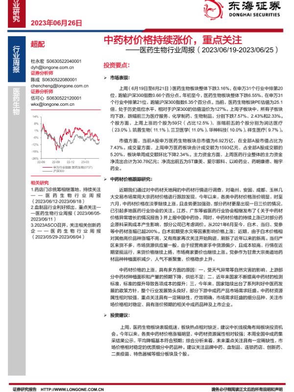 【东海证券】【20230626】中药材价格持续涨价,重点关注-15页