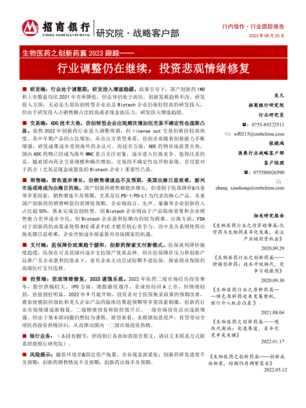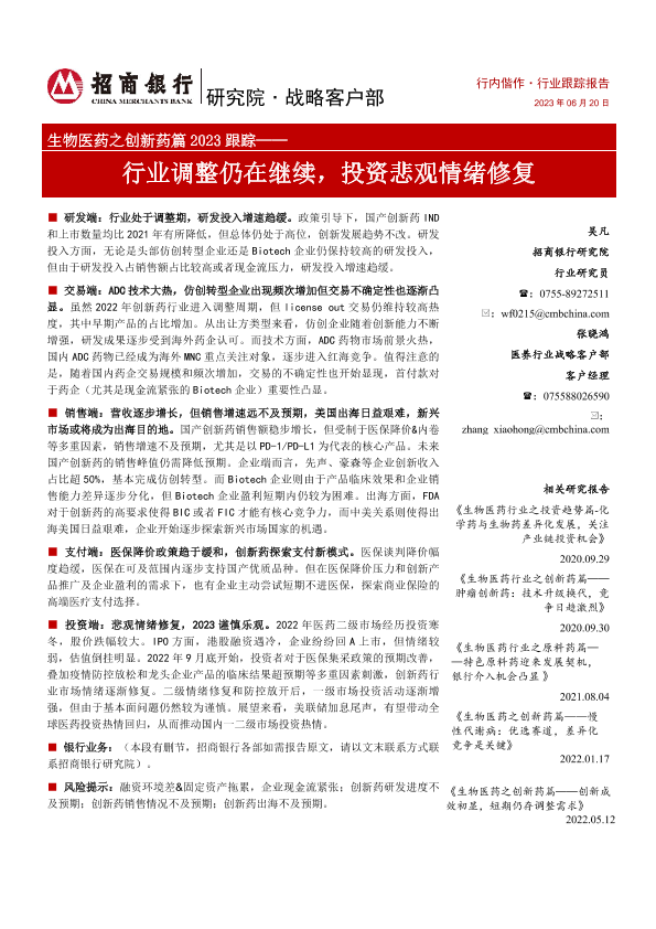 【招商银行】【20230620】生物医药之创新药篇2023跟踪:行业调整仍在继续,投资悲观情绪修复-22页