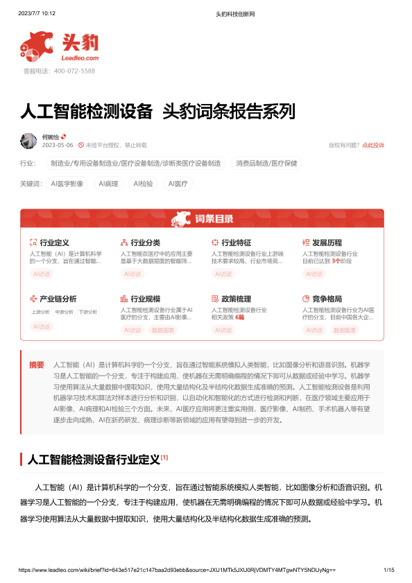 【头豹研究院】【20230707】人工智能检测设备 头豹词条报告系列-15页
