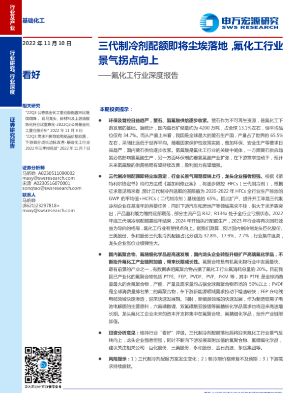 【申万宏源】【20221110】氟化工行业深度报告:三代制冷剂配额即将尘埃落地,氟化工行业景气拐点向上-44页