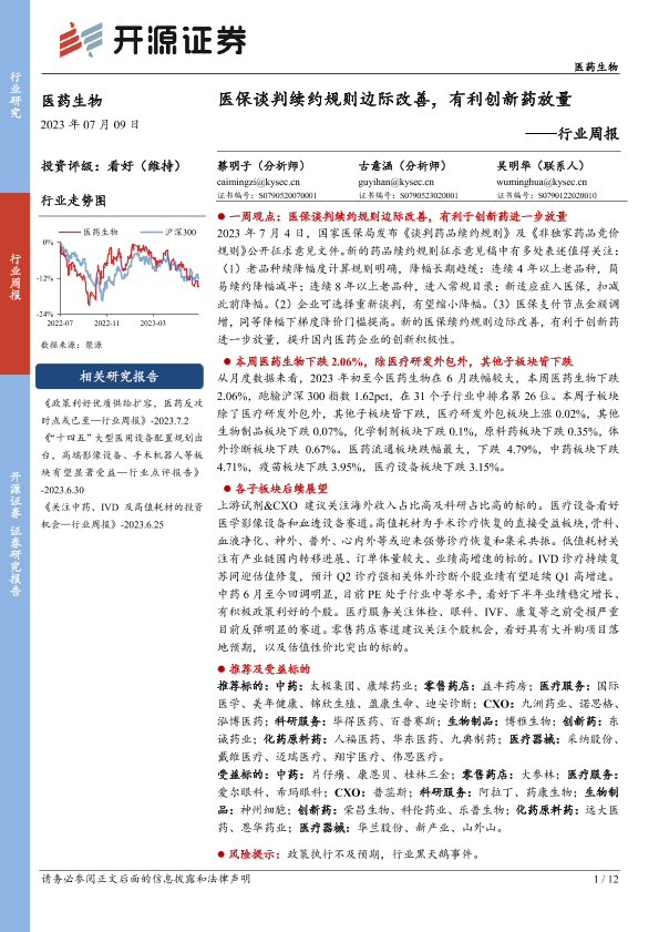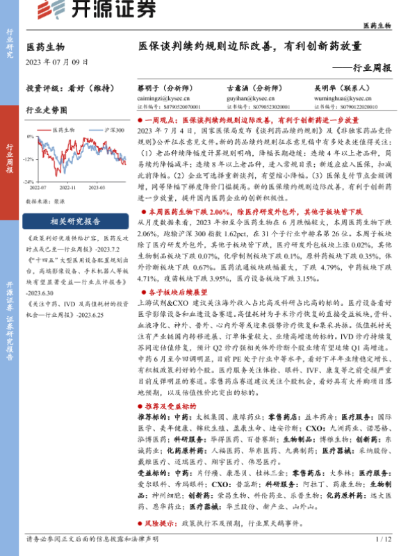 【开源证券】【20230709】医药生物行业周报:医保谈判续约规则边际改善,有利创新药放量-12页