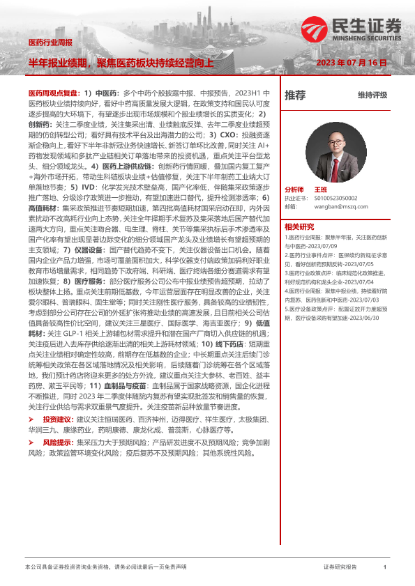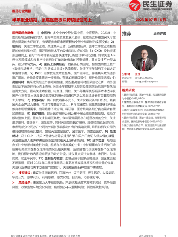 【民生证券】【20230716】医药行业周报:半年报业绩期,聚焦医药板块持续经营向上-31页