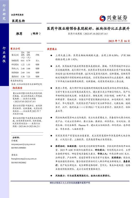 【兴业证券】【20230716】医药中报业绩预告表现较好,板块性价比正在提升-15页