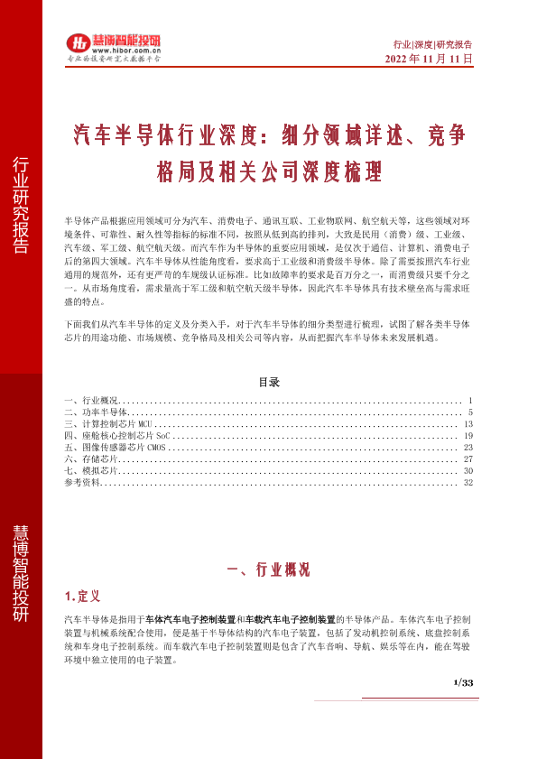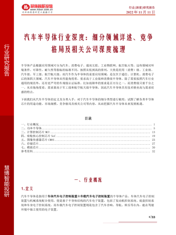 【慧博智能投研】【20221111】汽车半导体行业深度:细分领域详述、竞争格局及相关公司深度梳理-33页