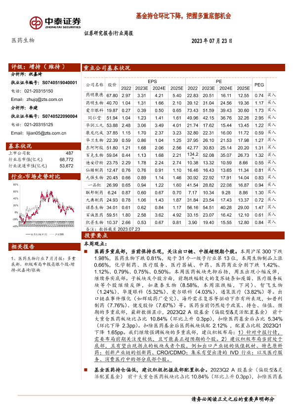 【中泰证券】【20230723】医药生物行业周报:基金持仓环比下降,把握多重底部机会-12页