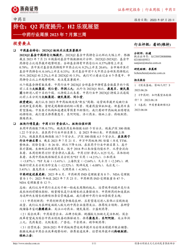 【浙商证券】【20230723】中药行业周报2023年7月第三周:持仓:Q2再度提升,H2乐观展望-11页