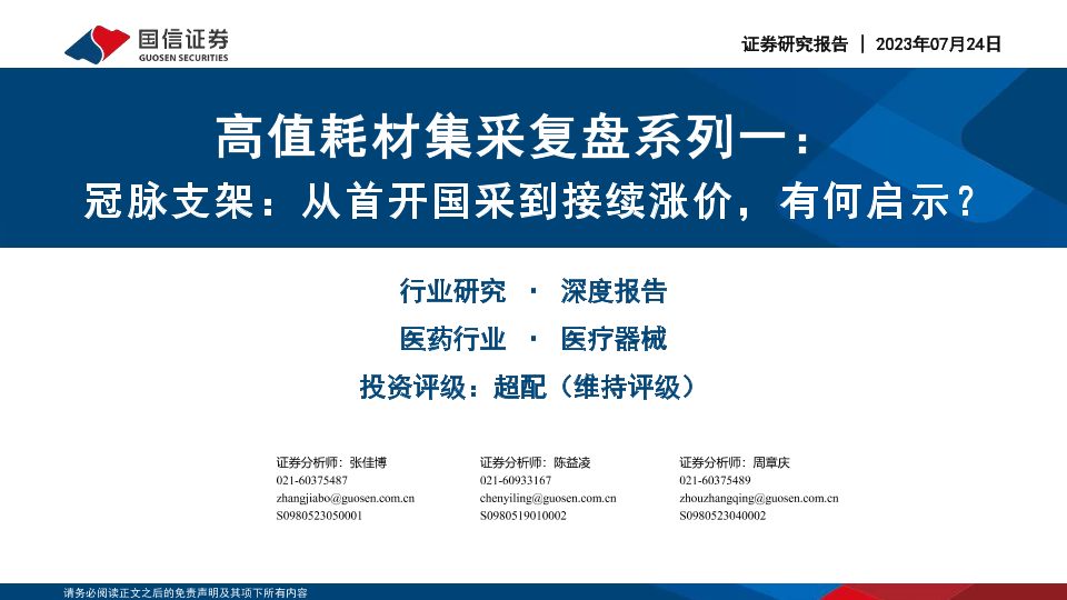 【国信证券】【20230724】高值耗材集采复盘系列一:冠脉支架:从首开国采到接续涨价,有何启示?-26页