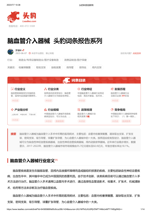 【头豹研究院】【20230725】脑血管介入器械 头豹词条报告系列-14页