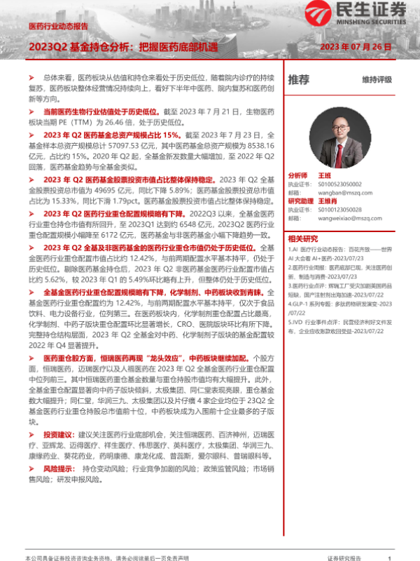 【民生证券】【20230726】2023Q2基金持仓分析:把握医药底部机遇-24页