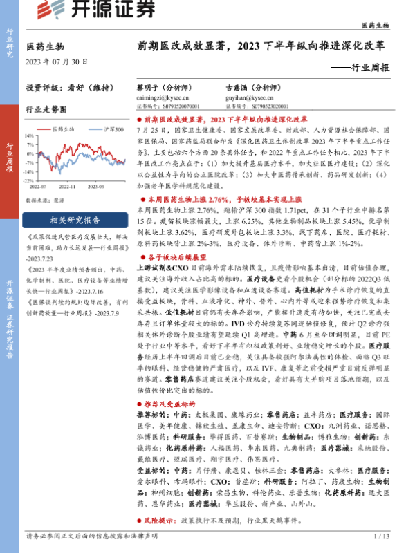 【开源证券】【20230730】医药生物行业周报:前期医改成效显著,2023下半年纵向推进深化改革-13页