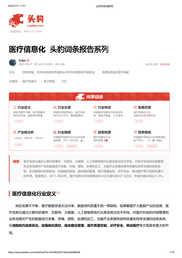 【头豹研究院】【20230711】医疗信息化 头豹词条报告系列-18页