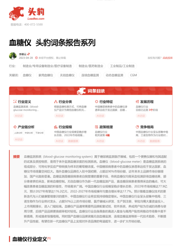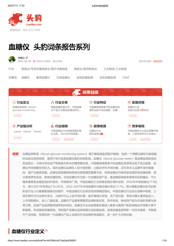 【头豹研究院】【20230711】血糖仪 头豹词条报告系列-19页