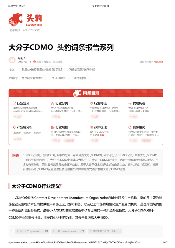 【头豹研究院】【20230721】大分子CDMO 头豹词条报告系列-17页
