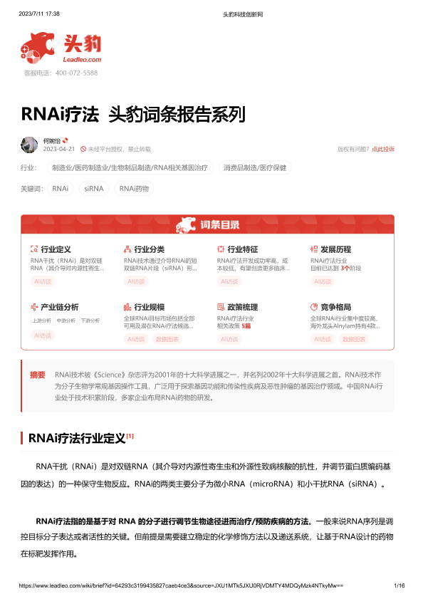 【头豹研究院】【20230711】RNAi疗法 头豹词条报告系列-16页