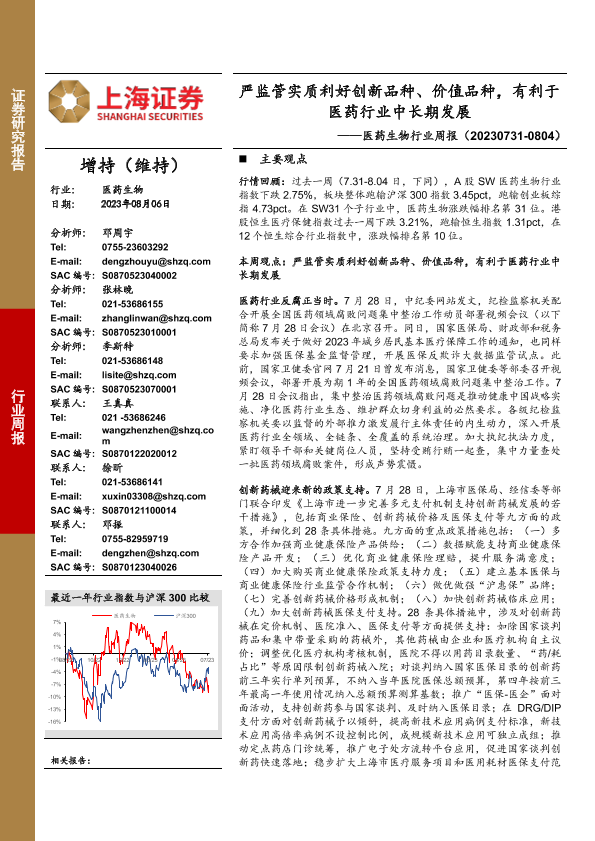 【上海证券】【20230806】医药生物行业周报:严监管实质利好创新品种、价值品种,有利于医药行业中长期发展-23页