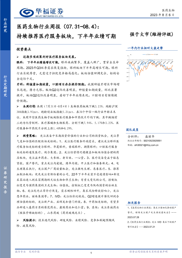 【华福证券】【20230806】医药生物行业周报:持续推荐医疗服务板块,下半年业绩可期-16页
